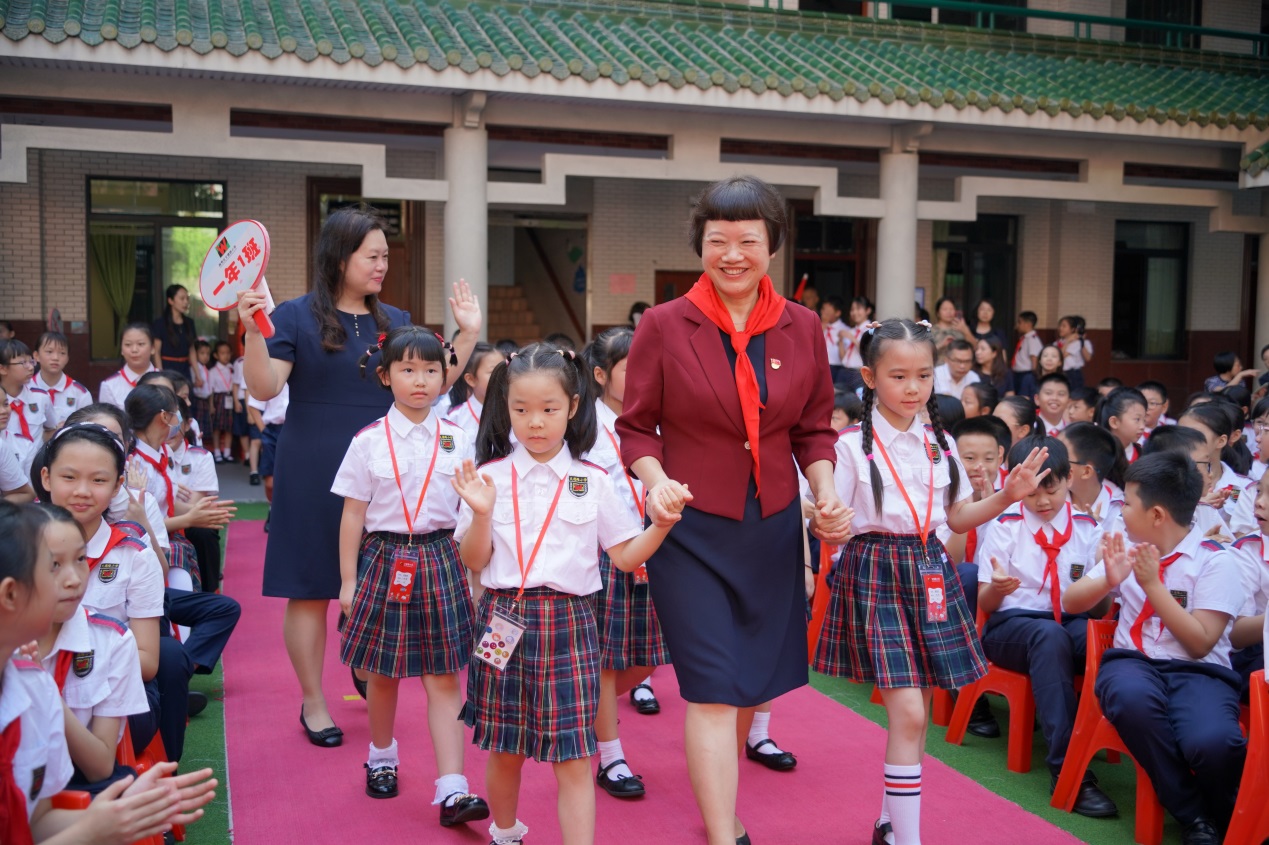 文德路小学校长黄丽芳引领着一年级新生走红地毯