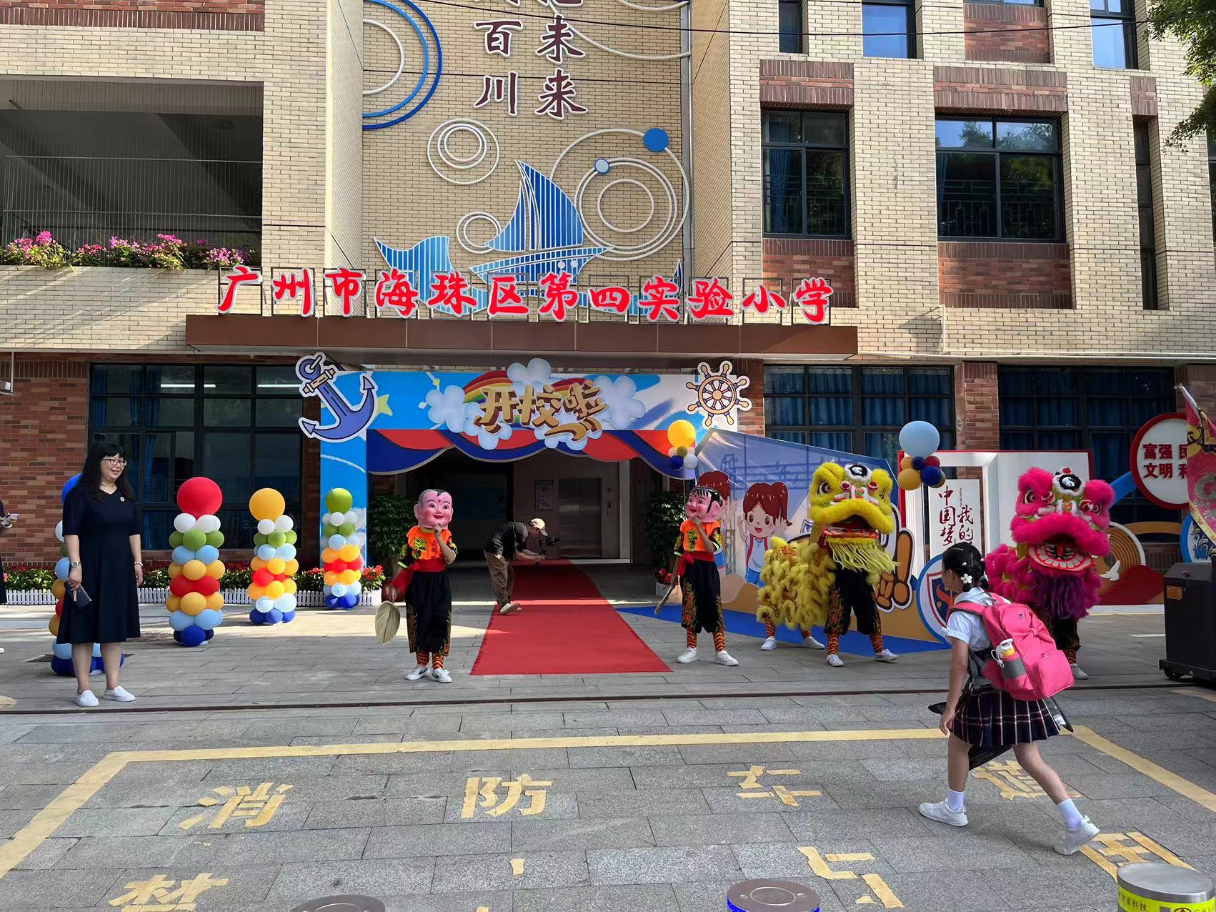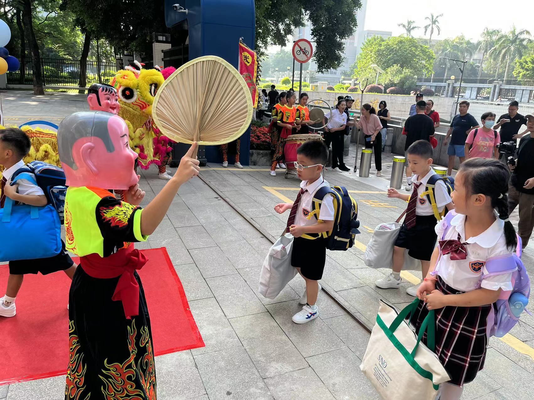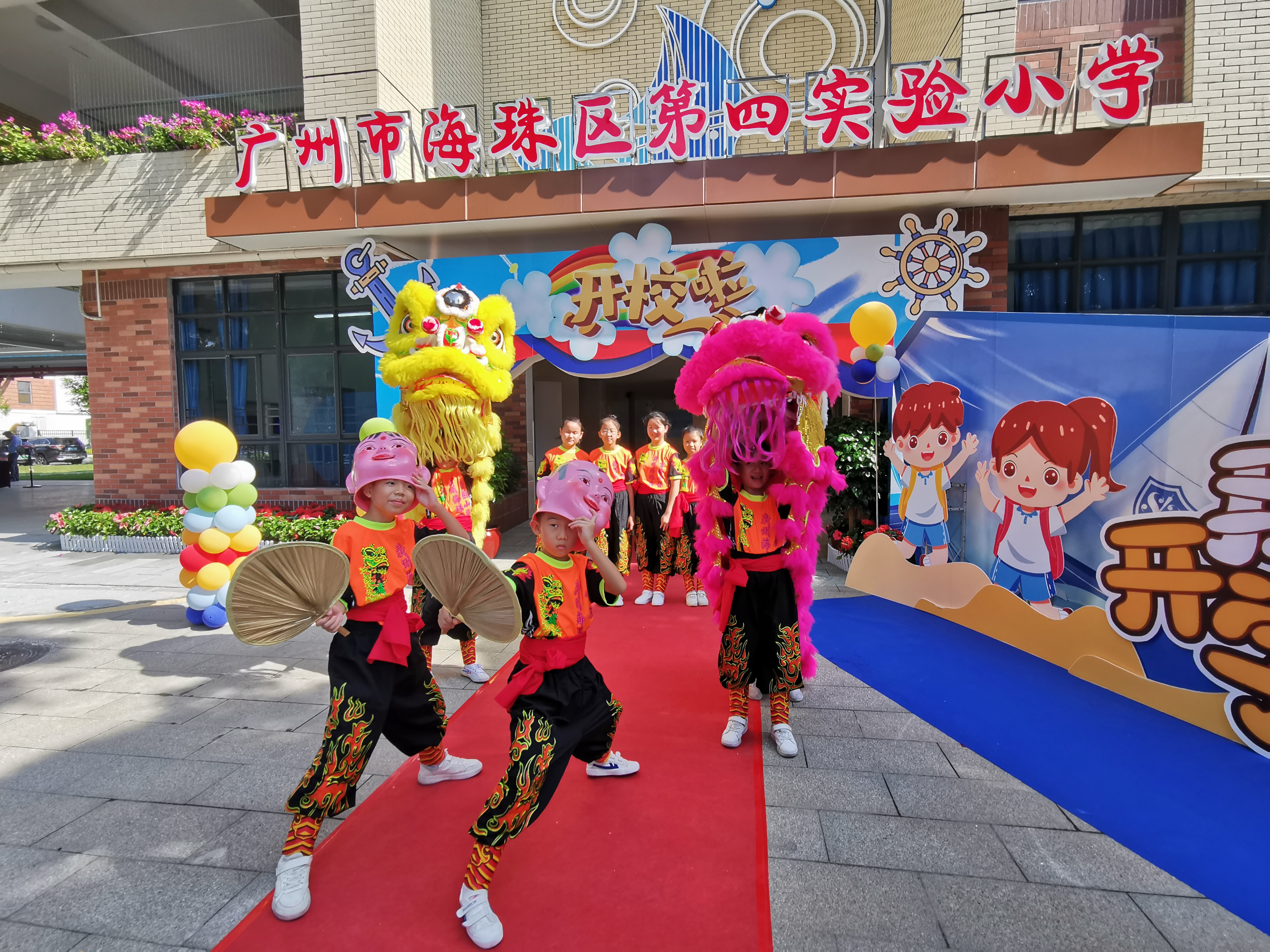 9月4日早上,广州市海珠区滨江东路中大北门广场西侧锣鼓声声热闹非凡,全新的海珠区第四实验小学(下称“实验四小”)正式开学,海珠区实验小学武术队的哥哥姐姐们舞着狮,迎接实验四小的小一新生们。