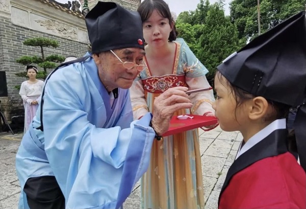 增城区小楼镇仓沮圣庙开笔礼仪式上,老教师为学童点朱砂。信息时报见习记者 李思睿 摄