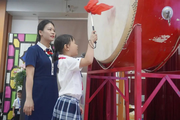 越秀区旧部前小学的新生击鼓明志。信息时报记者 黄丽霞 摄