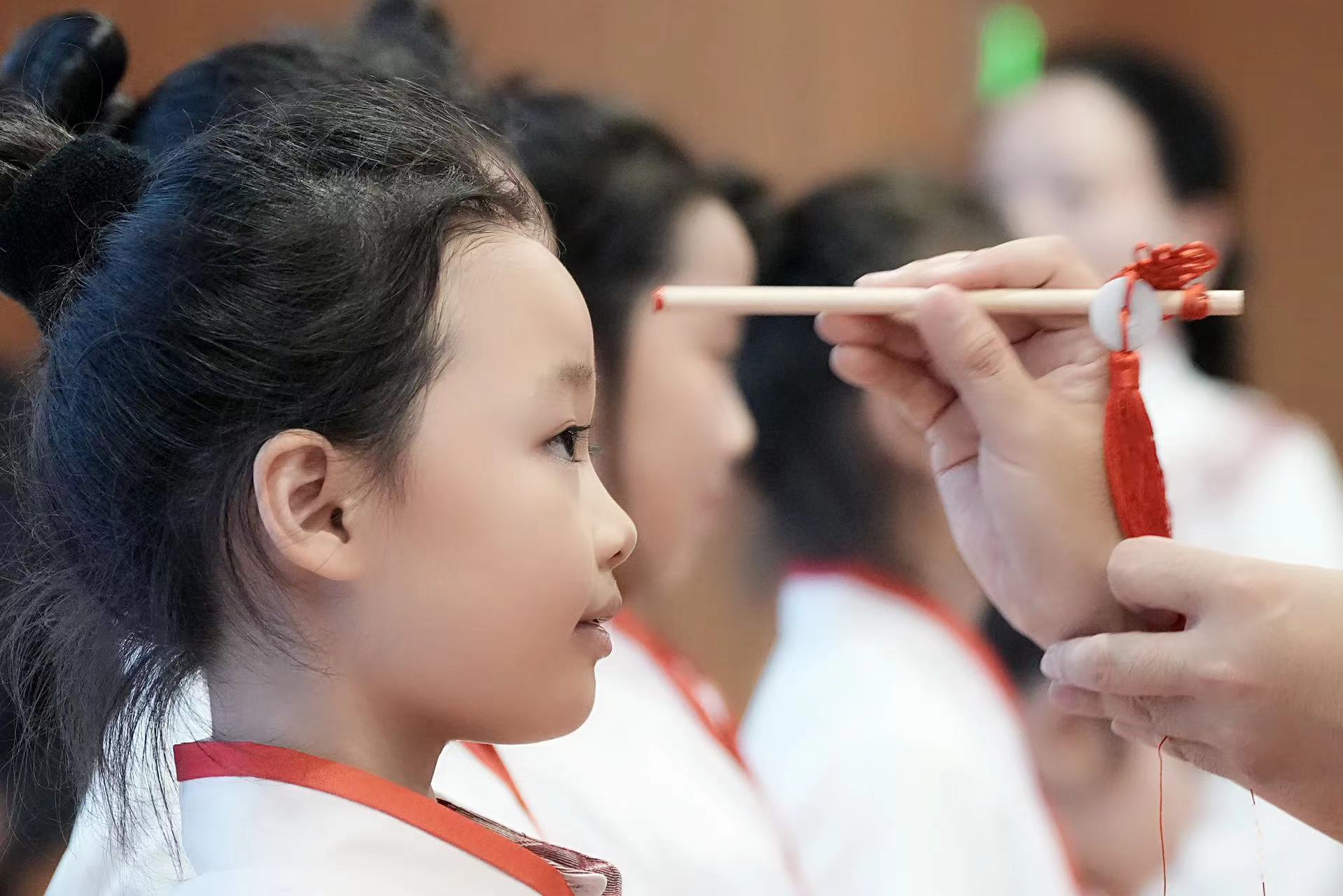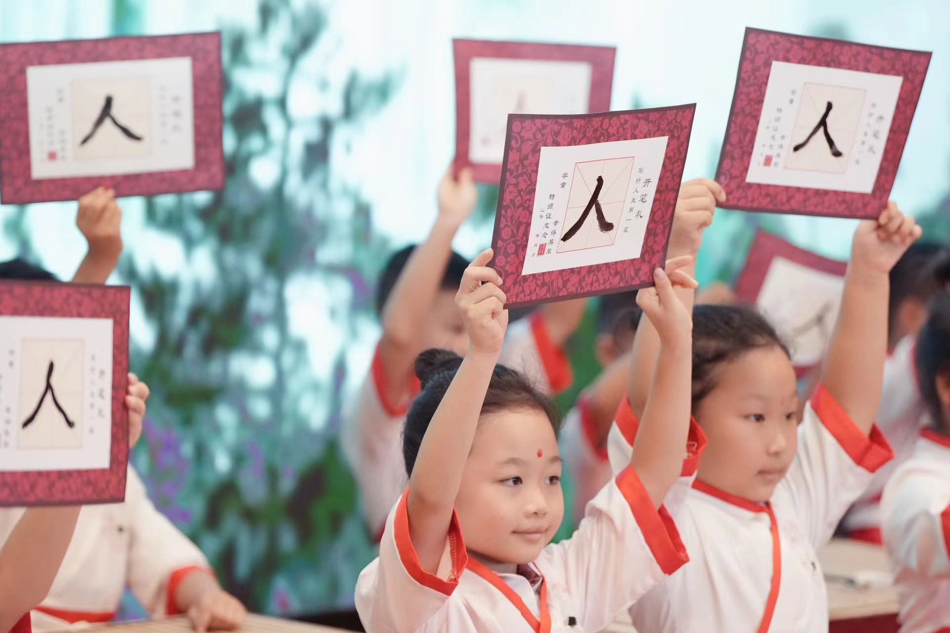 揭牌仪式后,一年级和二年级的新生们在老师们的带领下进行了庄重而富有仪式感的开笔礼。自正衣冠,朱砂启智,启蒙描红,感恩鞠躬,击鼓鸣志,饱含厚重的中国文化气息,蕴含着求学问道、尊师重教的思想,引导孩子们走“正道”、存“善心”、知“礼节”,懂“感恩”。