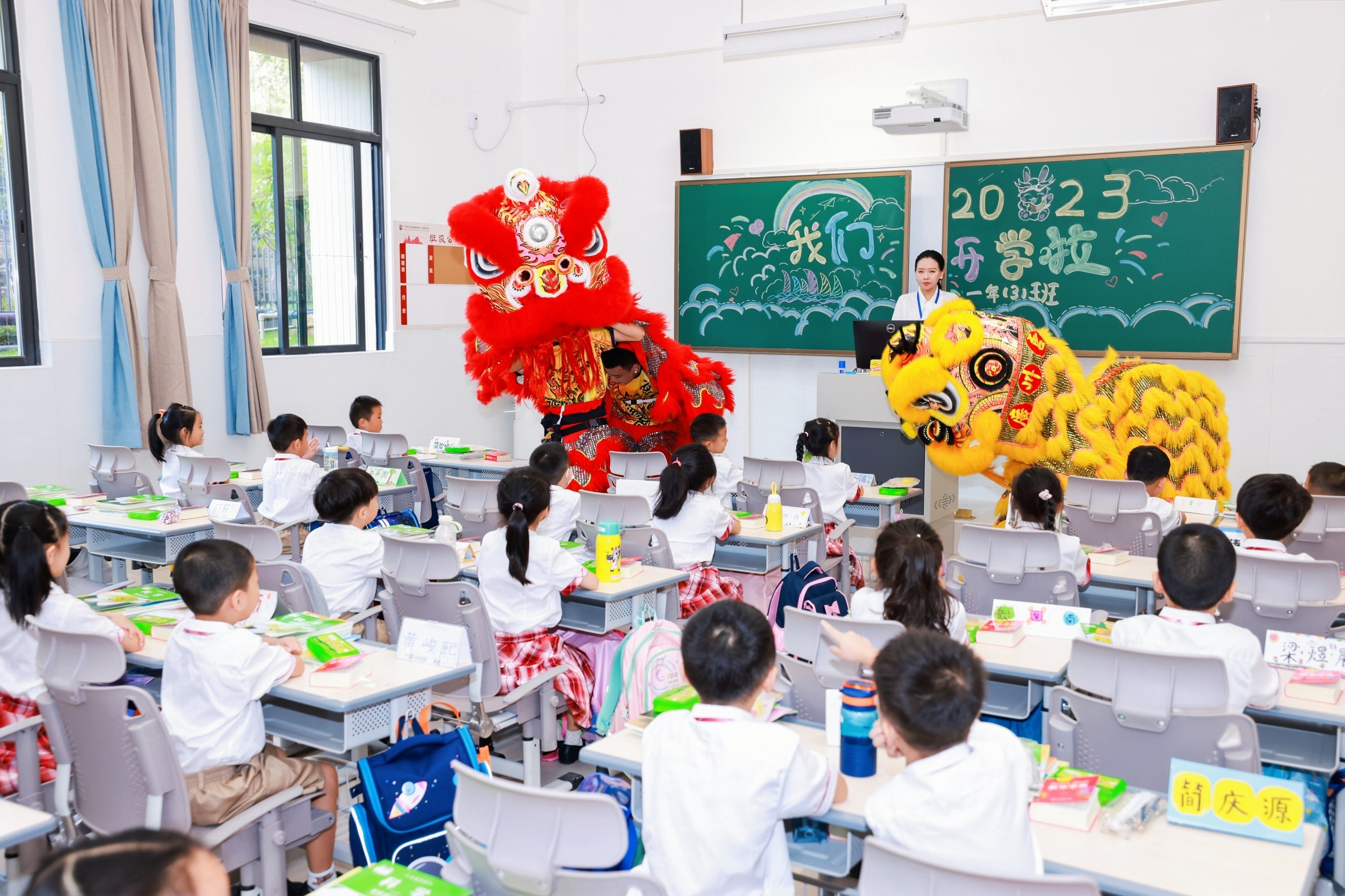 天河区智谷第一实验学校老师黄晓婷介绍,作为新开办的学校,为了迎接新学期,学校特意设置了舞狮环节。“舞狮寓意着孩子们像狮子一样勇敢,自信,进取。同时狮子也有献瑞送福的好寓意。”