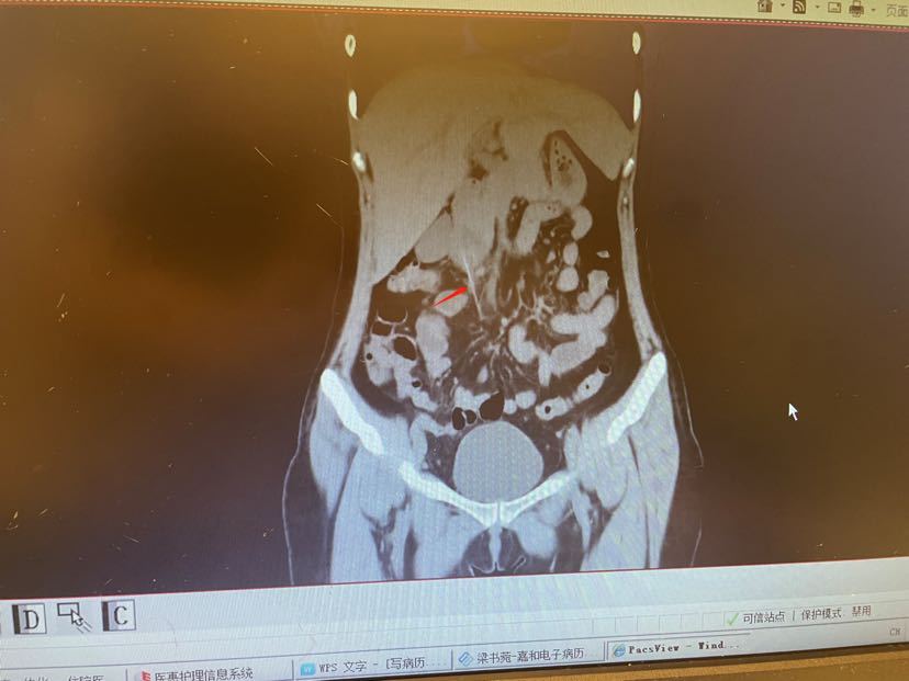 完善全腹CT后,发现十二指肠降段见一长条形物体,部分位于肠腔外,推测为异物可能大,异物穿透肠壁,肠周渗出较多,且腹部查体可及压痛、反跳痛、腹肌紧张等腹膜刺激征。随着肠蠕动,异物有可能刺伤其他脏器,情况十分危急,患者随即转入普通外科进行急诊手术。