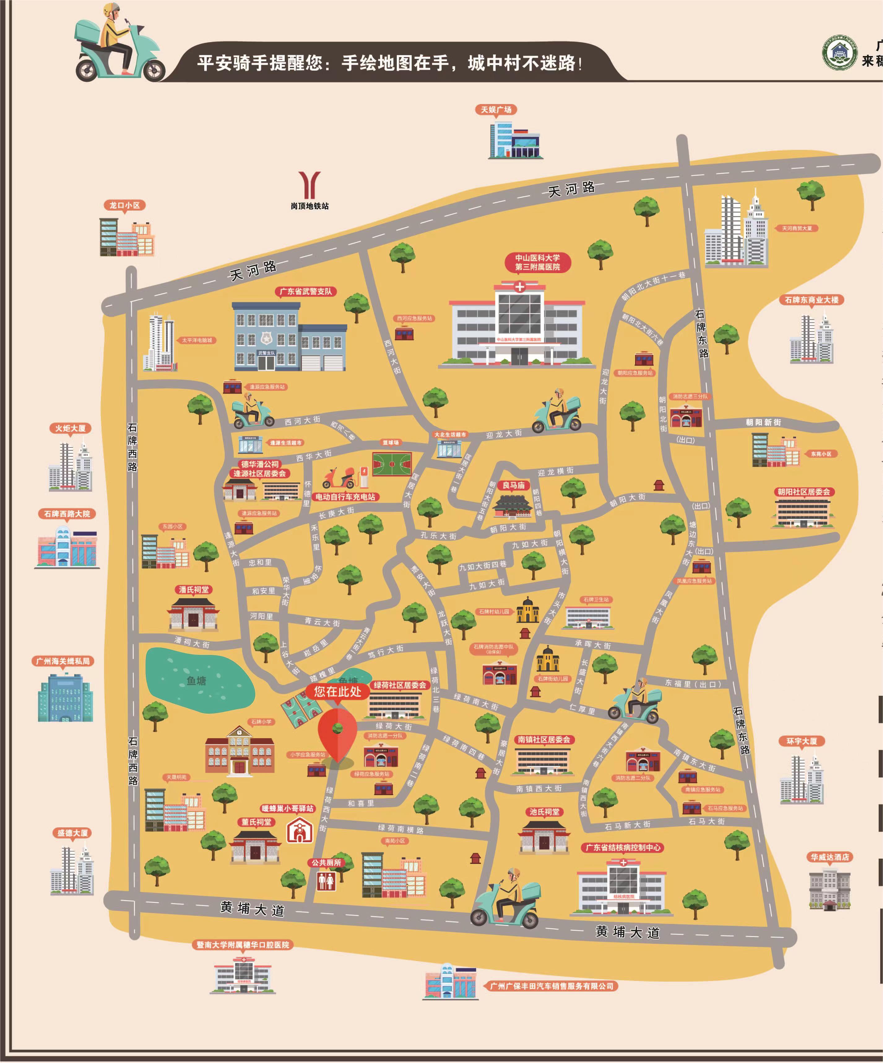 记者从天河区石牌街获悉,针对石牌村内房屋建筑密度大,村道巷曲交织如蛛网,道路辨识有难度的问题,在天河区来穗人员服务管理局和石牌街道办事处的支持和指导下,石牌街道综合保障中心联动广州市广仁来穗人员服务中心、社区党支部、外卖快递企业党支部等,聚焦于“城中村易迷路”的问题,动员唐泽权、赵其武等石牌“平安骑手”来穗志愿力量,积极参与“城中村不迷路”活动,历时9个月制作了首张“石牌村手绘地图”。