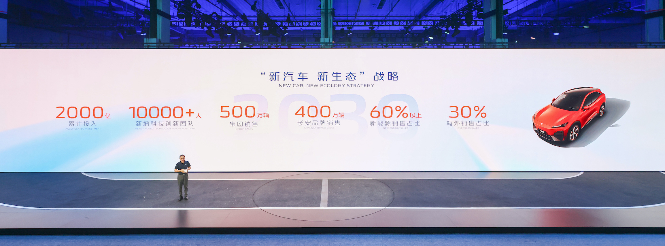 阿维塔科技新款产品阿维塔11鸿蒙版上市一周锁定订单破5000辆,首款轿车阿维塔12将于第四季度上市;深蓝汽车成功推出深蓝SL03和深蓝S7,8月深蓝S7交付超过1万辆;“数智进化新汽车”长安启源,将于本月开启首款产品长安启源A07预订,E0系列首款产品CD701将于明年正式量产上市。一系列的新品牌新产品迭出,显示长安汽车在数智上的新成果。9月4日,在“2023长安汽车科技生态大会”上,除了展示首发SDA平台架构量产技术成果,长安汽车董事长、党委书记朱华荣进一步解读了公司的未来发展规划:坚定推进“新汽车 新生态”战略,到2030年累计投入2000亿元,新增1万余人的科技创新团队,实现集团销售500万辆,其中长安品牌400万辆,新能源销售占比60%以上,海外销售占比30%,成为“数智新汽车”时代的引领者。