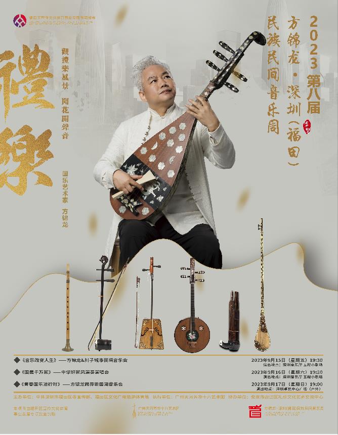 据了解,著名国乐艺术家、乐器收藏家、当代五弦琵琶代表人物方锦龙,自2013年担任深圳福田区文化大使以来,一直以努力为福田擦亮民族音乐品牌为己任,率领团队——广州天河芳华十八艺术团,在福田举办了诸多音乐会、国乐讲演会,所创办的“方锦龙•深圳(福田)民族民间音乐周”迄今已成功举办七届。每届连续三场精彩民族音乐会,均汇聚国内民族音乐界大家、名团,也曾邀请过日本、韩国、印度、以色列、加拿大、美国等多个国家的著名音乐家参与,共同弘扬中国民族音乐。