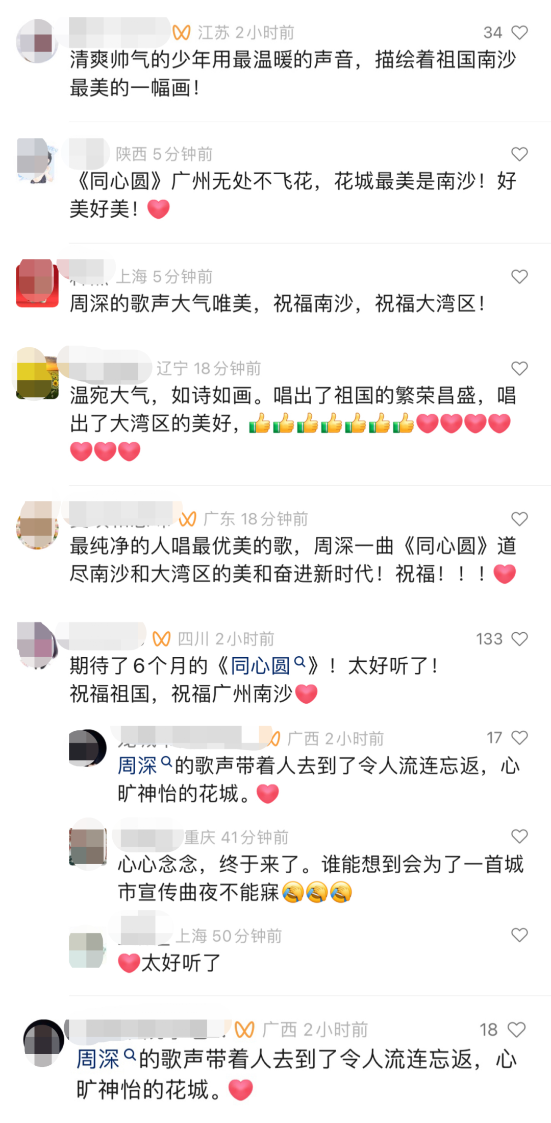 当天,广州南沙城市形象宣传原创歌曲《同心圆》MV正式对外发布,并在微博、视频号、微信公众号及QQ音乐、酷狗音乐、全民K歌及APPLE MUSIC、YOUTUBE等国内外传播平台正式上线。当天一上线就受到热烈反响,许多人都留言想要来南沙走一走。