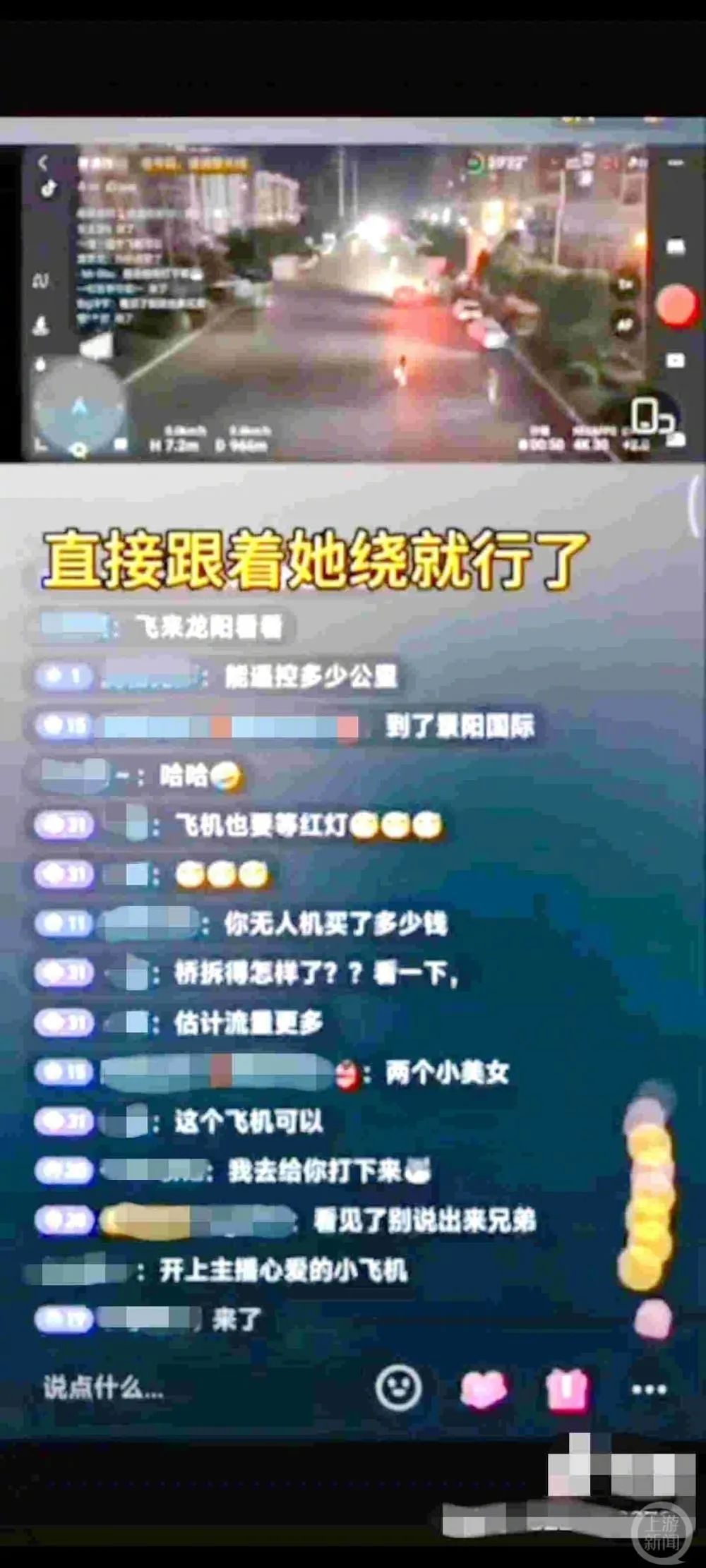 该直播视频经网友录屏转发,引起无数网友公愤,大家纷纷留言:“用无人机尾随女孩子,好恐怖,希望公安机关严惩。”“要是回自己家的独居女性,被别有用心之人发现住址,那真是太可怕了”“尾随他人还开直播造谣,真是吓人!”