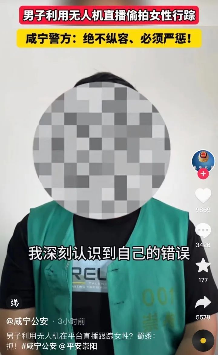 6日,咸宁市公安局网安大队表示,事发咸宁崇阳,该男子汪某用无人机偷拍女性行踪并在网络直播,造成恶劣影响,涉嫌寻衅滋事,目前该男子已被查处。9月4日,汪某被处以行政拘留10日,该处罚已于当日开始执行。