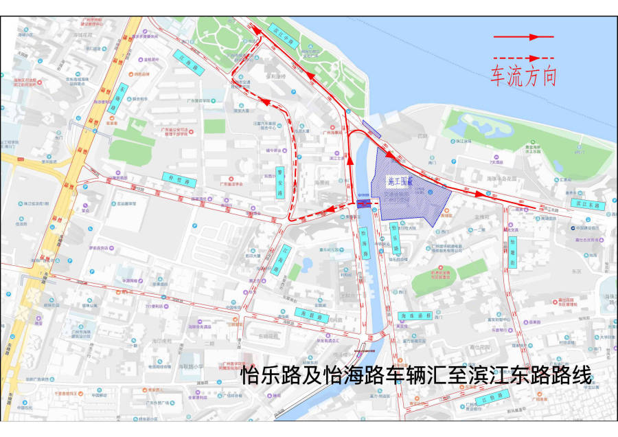 怡乐路(鸭墩涌桥至交通便桥段)仍维持围蔽施工,围蔽时间为2023年9月10日起,预计工期15个月。过往车辆可经由怡乐路→交通便桥→怡海路,或怡乐路→交通便桥→仲恺路→警安路至滨江东路(滨江中路)。