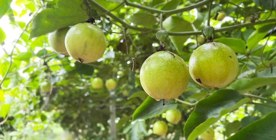 果园坐落在流溪河畔,走进百香果基地,一片绿意盎然,绿油油的藤蔓下,一个个如小灯笼般的果实挂满了长藤,可爱诱人,一派丰收的景象。