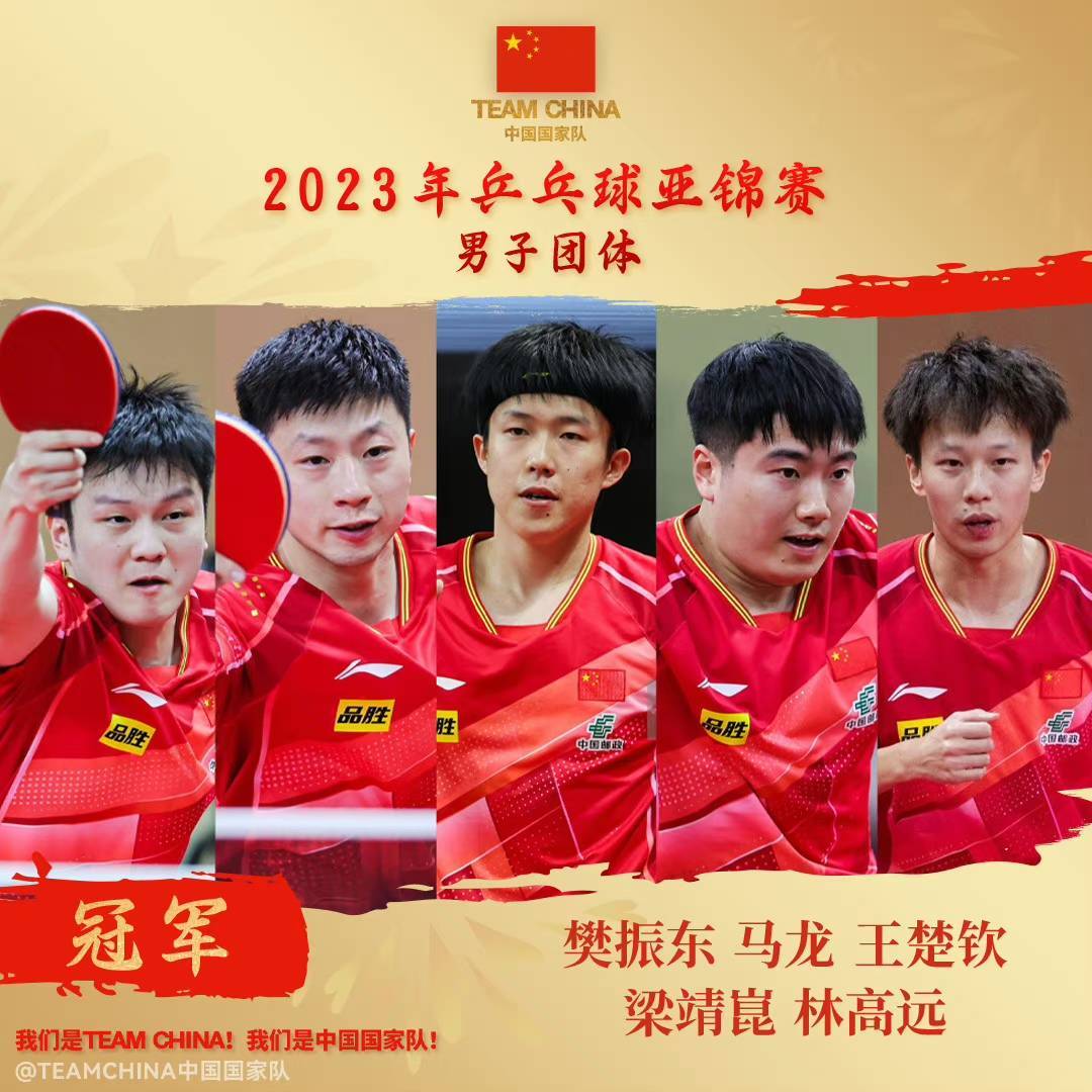 9月6日晚,2023年亚洲乒乓球锦标赛在韩国平昌结束男团决赛争夺,由王楚钦、樊振东和梁靖崑组成的中国队直落三盘击败中国台北队,夺得冠军。从小组赛到淘汰赛,国乒一盘未失,保持全胜战绩,展现了强大实力。恭喜中国队!