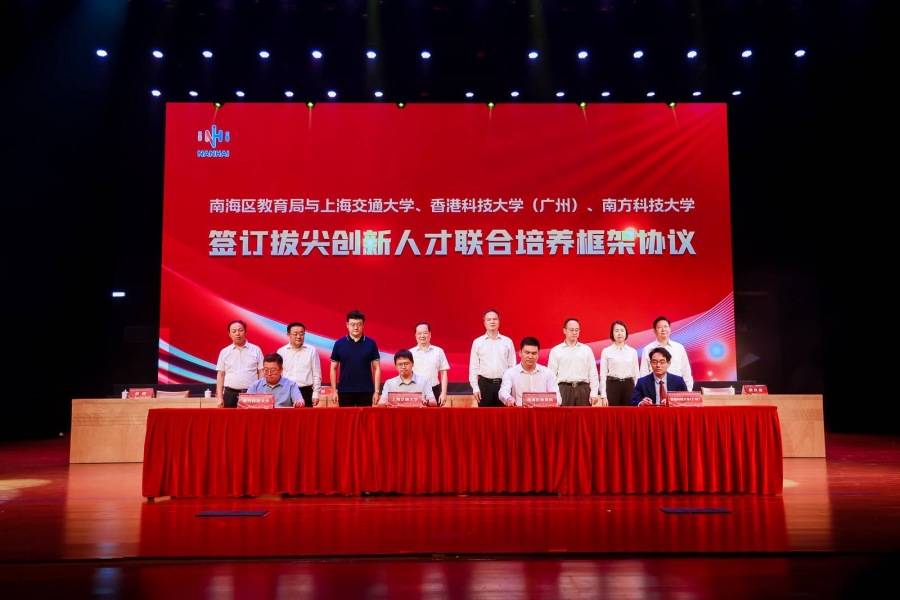而为进一步完善南海区英才培养荣誉进阶表彰体系,从今年起,南海区新设英才培养先进集体,把科学与人文监测评价与少年未来学院合并表彰,年度先进单位设立珠峰奖、鲲鹏奖和雄鹰奖,大会进行了现场颁奖。为进一步畅通学段衔接,加快建立拔尖创新人才一体化培养体系,南海区教育局依托高校优质资源,与上海交通大学、香港科技大学(广州)、南方科技大学签订拔尖创新人才联合培养框架协议。