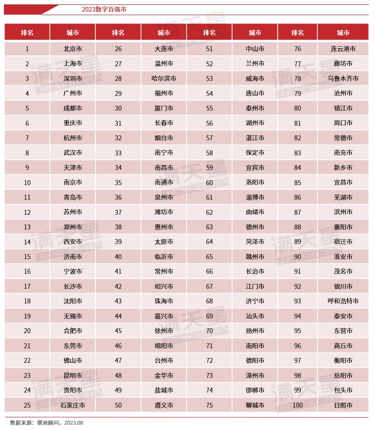 9月6日,在2023中国国际数字经济博览会上,2023数字百强市和《2023中国数字城市竞争力研究报告》正式发布。北京、上海、深圳、广州、成都位列2023数字百强市前五名。