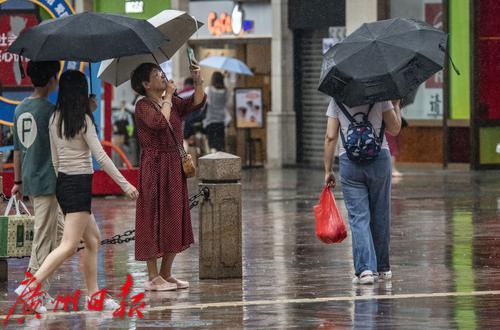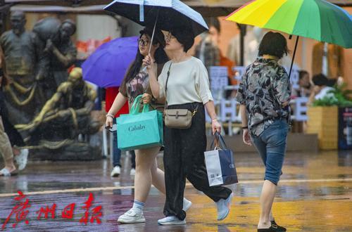 9月7日下午,荔湾区上下九广场,冒雨前来逛街的游客。