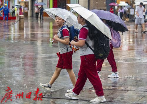 9月7日下午,广州荔湾区上下九广场,放学回家的学生在雨中前行。