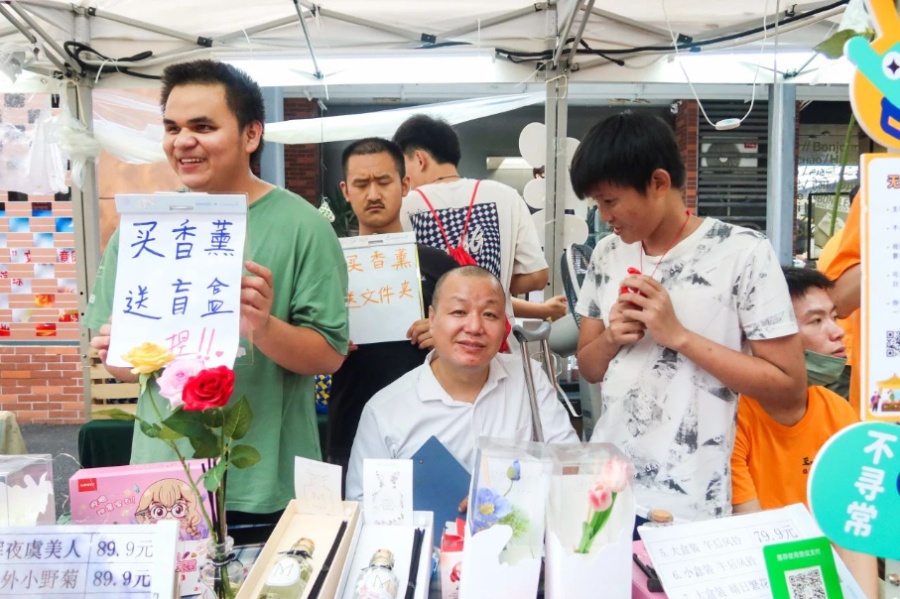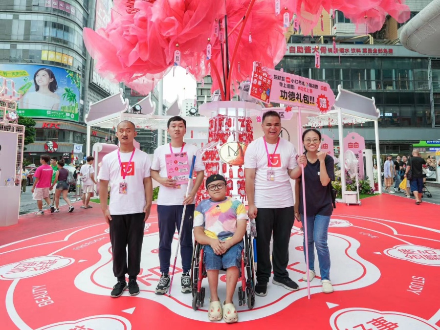 要创造价值,一方面需要无障碍环境的支持,另一方面,也对残障人士的职业素养提出了比传统盲人按摩更高的要求,摆在面前的不再是一份重复性的工作。这时,作为普通人思考是第一步,而了解社会所需并回应则是第二步。过去的这些天,曲望深度参与了一系列摆摊销售行动,一直售卖名创优品的产品。最初按部就班跟着销售话术把介绍说出来,接着不断迭代自己的销售方式、风格和语言,后来报名做了摊位小队长,尝试了团队管理,在企业支持下更是和学平等视障伙伴获得去名创优品广州旗舰店实习的机会,而在店内学习与顾客互动时有了企业需求的思维,在说出常规的欢迎光临后脱口而出“让您把花香带回家”。大家在这一次,看到了残障青年有可能创造的价值,这种创造性为融合打下了坚实的基础。