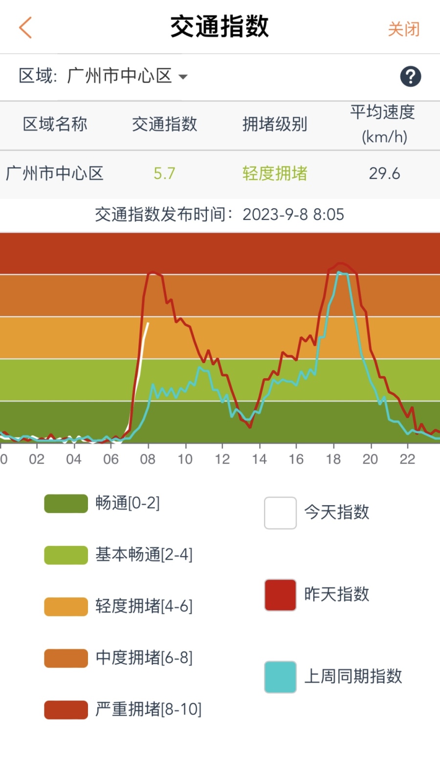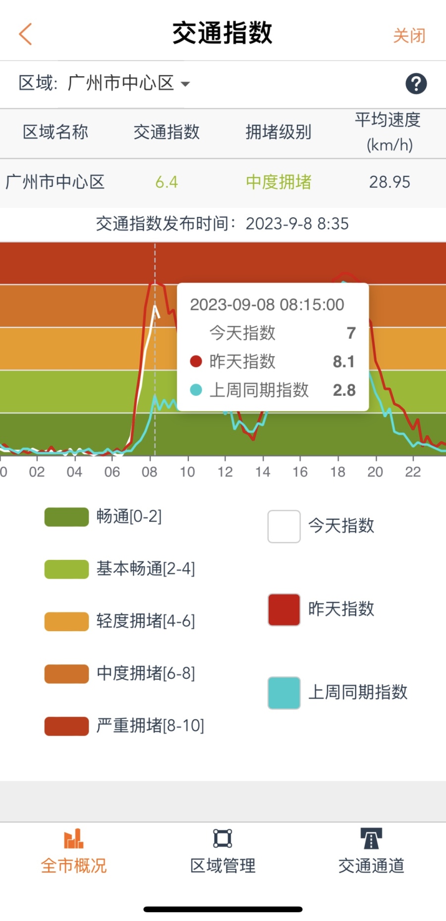 随后,广州市中心区交通指数继续拉升,8时15分,达到早高峰的最高值,数值为7,拥堵级别为中度拥堵;昨天指数为8.1,为严重拥堵;上周同期则为2.8,拥堵级别为基本畅通。随后,广州市中心区交通指数开始下降,9时5分广州市中心区交通指数为5.3,拥堵级别为轻度拥堵。