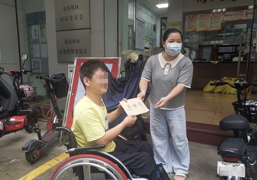 9月7日下午,虽然下着雨,但阻挡不了家住广州番禺沙湾东区荷景一区的肢体残疾人杨杨的步伐,他坐着轮椅先后来到东区社区居委会和小区物业管理处,分别向他们送上了感谢信,感谢社区和小区物业为他专门划设了一个残疾人专用停车位。
