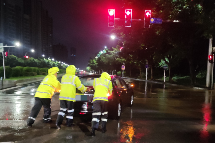 9月7日凌晨,受台风“海葵”影响,南沙区突发暴雨,部分道路积水严重,进港大道两台小车因水流过大抛锚,困在原地。南沙交警闻汛而动,迅速组织民辅警实施救援。民警叶佐俏和辅警冯伟贤、樊锦荣快速反应,对道路实行临时管控,疏导来往车辆,对被困车辆进行营救,最后合力将两台被困车辆推离积水路段,避免了交通事故的发生。