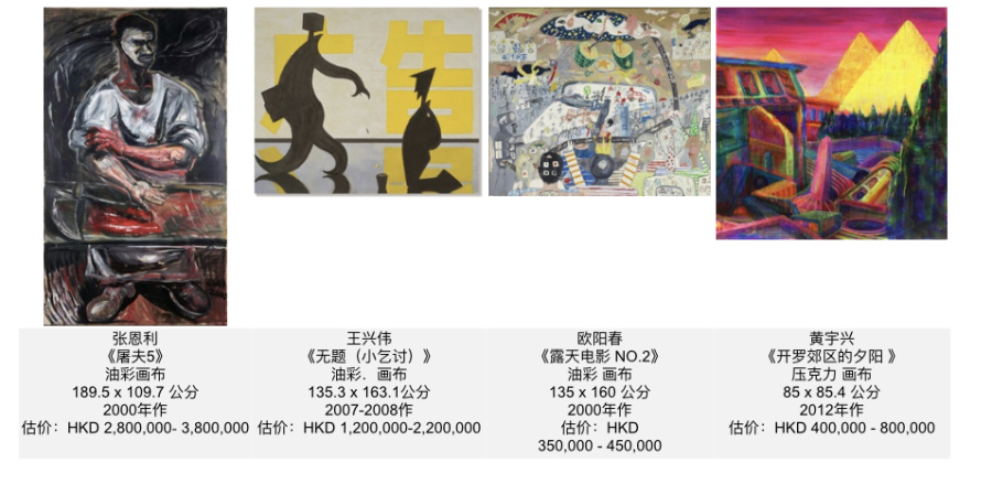 中国当代艺术部分同样精彩可期。张恩利90年代创作的首个高峰系列之一《屠夫5》、王兴伟别出心裁的《无题(小乞讨)》、欧阳春《露天电影之二》及黄宇兴《开罗郊区的夕阳》等,皆是市场最炙手可热的作品。