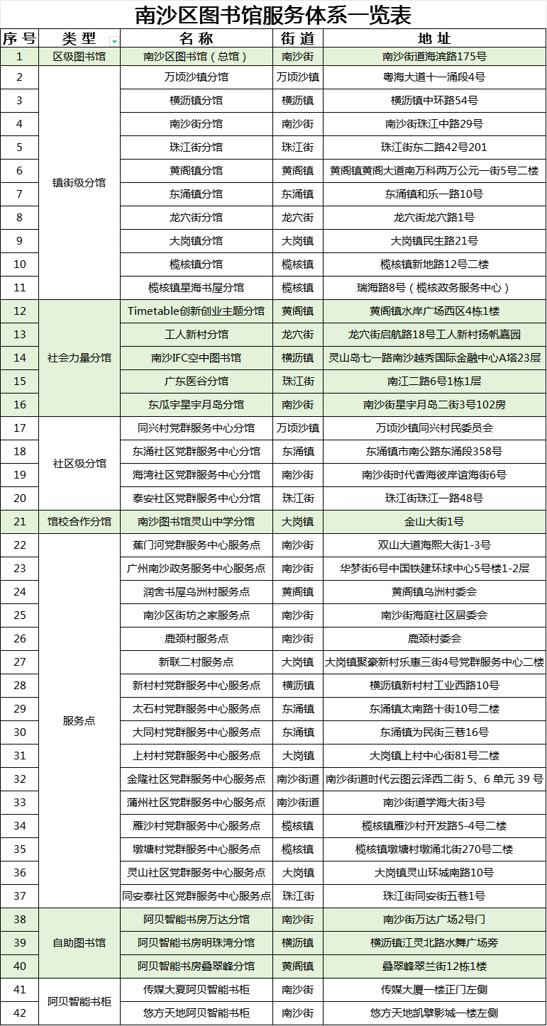 据统计,南沙区实现通借通还且面向所有公众免费开放的公共图书馆分馆(服务点)共40个,其中区级图书馆1个、镇街分馆10个、社会力量分馆5个、馆校联合分馆1个、社区级分馆4个、服务点16个、阿贝智能书房3个,累计藏书近40万册,分馆(服务点)已覆盖南沙区各个镇街。