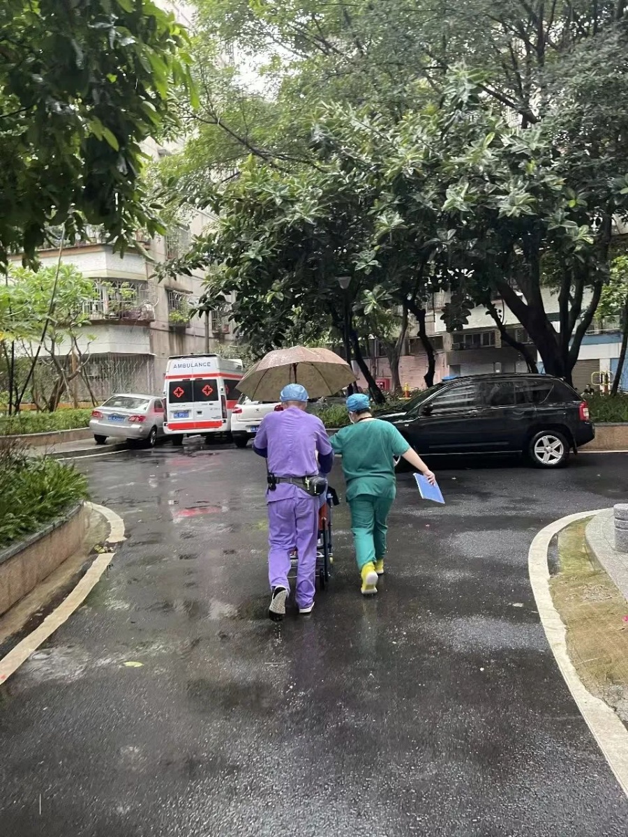 9月8日早上9点10分左右,佛山市第二人民医院急诊科分诊台接到120指挥中心来电,称禅城区城门四街有位长期卧床的86岁阿婆腹痛,需要救助。医务人员紧急出车赶往现场,由于老旧小区街道较为狭窄,救护车无法进入。急诊科医生庞彦杰和担架员汤正斌等立刻下车,找楼、爬楼,把阿婆从家中接下来。接到阿婆时,天又下起了雨,庞医生和担架员于是一个推轮椅一个给阿婆撑伞,将阿婆护送到救护车上。他们的衣服湿了,身上也分不清是雨水还是汗水。这一幕也被路过的市民拍照记录了下,温暖了许多人。