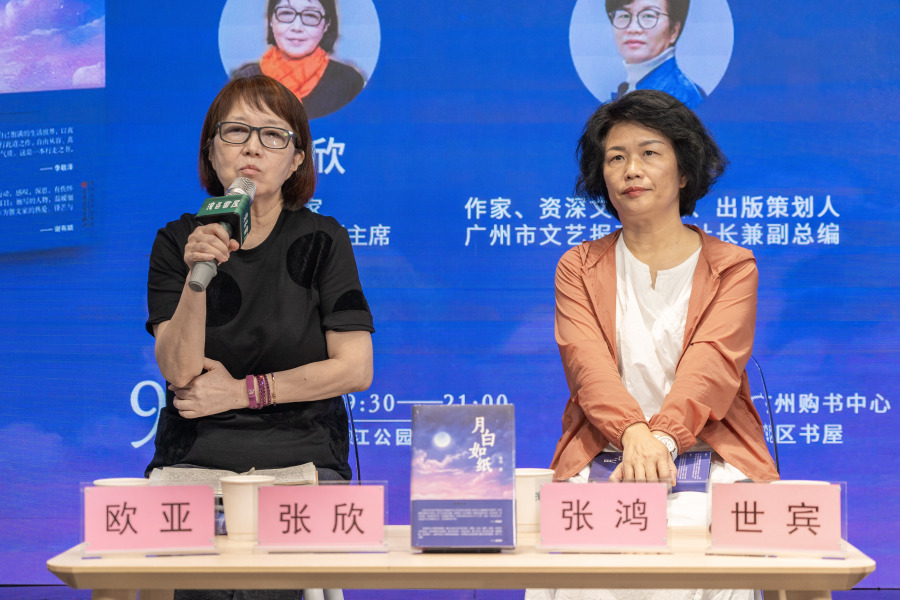活动现场,作家、广东省作家协会副主席张欣,作家、资深文学编辑、出版策划人、广州市文艺报刊社副社长兼副总编张鸿与诗人、评论家、东荡子诗歌促进会会长世宾三位嘉宾围绕张鸿的最新散文集《月白如纸》一书展开了精彩对谈。