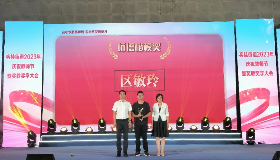 区敏玲的儿子(中)为逝去的母亲代领师德楷模奖