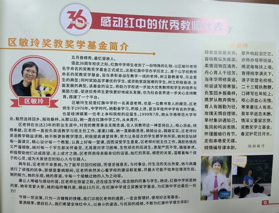 当时,区敏玲老师为所任教的红旗中学准备了一份“特殊的礼物”——嘱托家人向学校捐出的10万元,这是她为挚爱的教育事业所做的最后努力。后来,该校为缅怀她并纪念其善举,设立了区敏玲奖教奖学基金,希望以此激励在校师生不负韶华、奋发向上、争创佳绩。