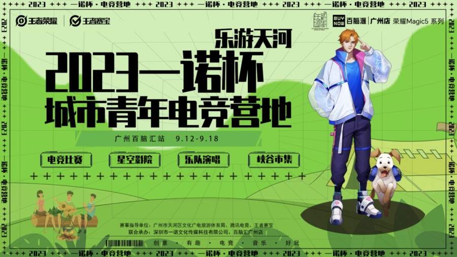 乐游天河•2023一诺杯城市青年电竞营地将于9月12日-9月18日在广州市天河区百脑汇外广场举行,涵盖王者荣耀电竞赛事(团队赛、个人赛、情侣赛)、露营影院、草坪音乐会、王者峡谷市集等时下年轻人喜爱的运动项目和交流方式。