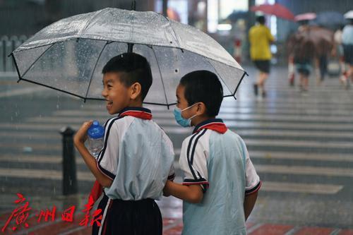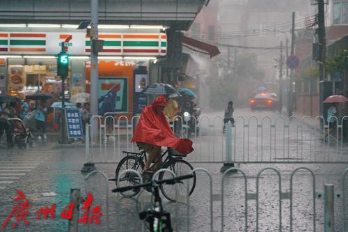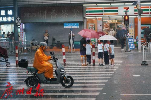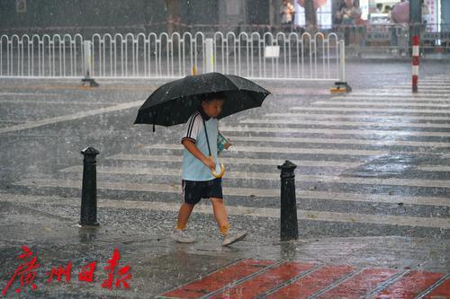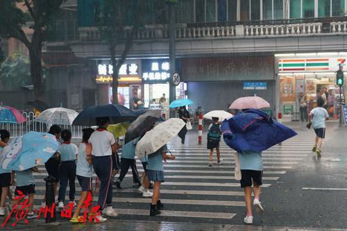 9月11日下午两点,广州城区突降暴雨,路上行人措手不及,纷纷快速奔跑躲雨,骑手穿戴雨具冒雨前行,小学生也冲入雨中返校上课。