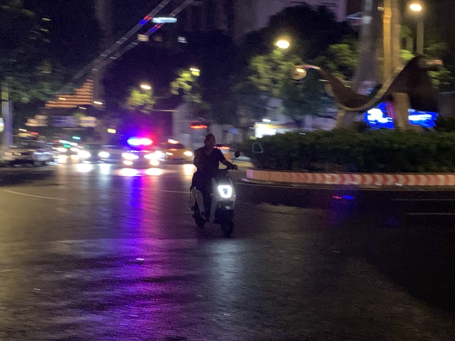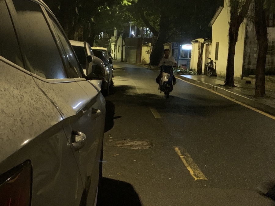 没有开车灯的电动自行车行驶到灯光昏暗处,更是犹如“消失”一般,如果不仔细观察,很容易不“被看见”。