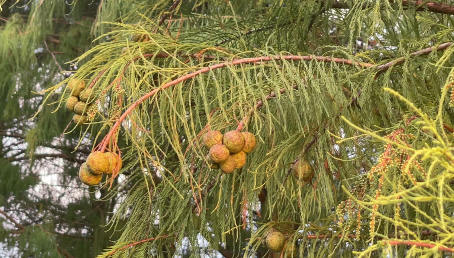除了“爆红”时极具观赏价值的缤纷叶色,落羽杉的花果也特色分明,引人注意。它的花为单性花,雌雄同株。细小而簇生于枝顶的是雌花,细细长长、生于枝条顶端呈下垂状的是雄花。进入9月,在广州不但能欣赏到落羽杉最后的花容,还能看到一颗颗即将成熟的球果沉甸甸地挂在树上,从像羽毛般柔细的互生叶片中露出小脸,格外引人注目。