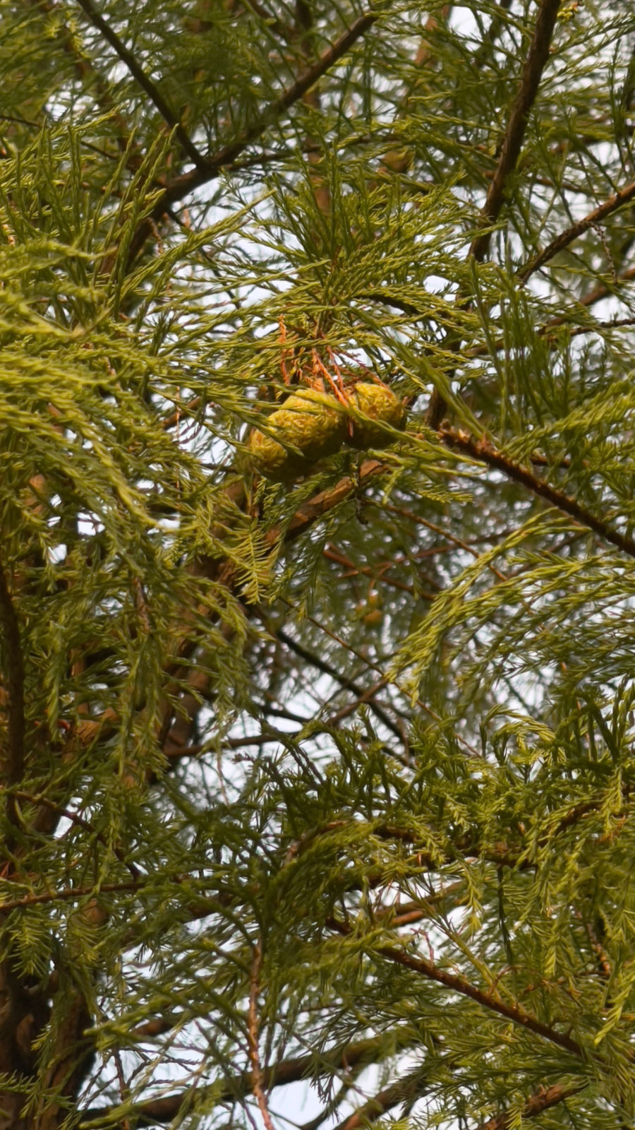 落羽松的球果不大,像乒乓球模样一颗颗连成串,细看之下表面有一格一格线痕,犹如雕琢着特别的古老图腾,甚是好看。球果初为绿色,成熟时淡红色、暗红色、紫褐色或淡黄褐色。球果成熟时会自动开裂,每年11月至次年1月,藏在球果里面的种子会成熟落果。那时你若从地上拾起一颗,便会感觉手上油油黏黏的,闻起来还有那么点儿香气。