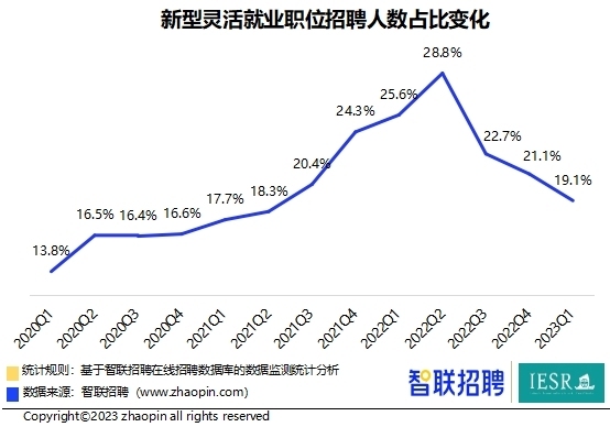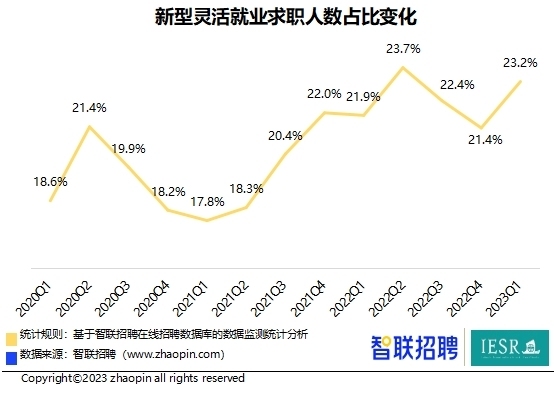 此外,求职总人数中新型灵活就业求职者数量占比不断提高,由2020年第1季度的18.6%上升至2023第1季度的23.2%。因此,无论从招聘端(需求侧)还是求职端(供给侧)来看,灵活就业人员规模约占到总体就业人员规模的五分之一。