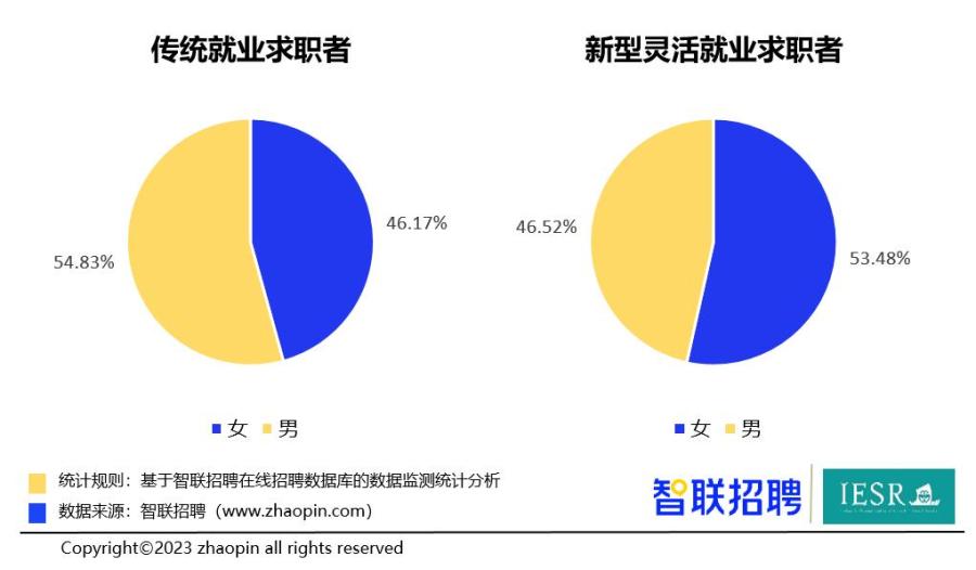 新型灵活就业求职者有什么特征?统计显示,传统就业求职者中女性占比仅为46.17%;而新型灵活就业求职者中女性超过半数,占比为53.48%。这表明新型灵活就业在女性群体中的受欢迎程度更大。