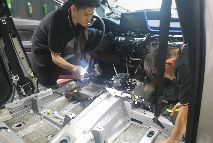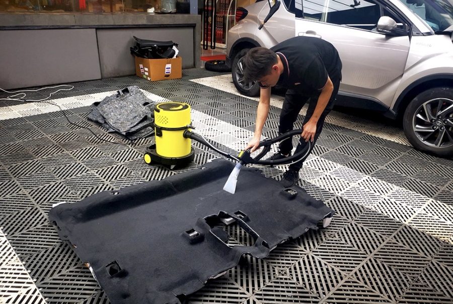 汽车修理厂的修理人员正在对泡过水的车内饰进行拆解和清洗