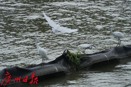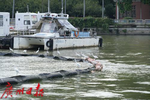 珠江水面的一圈拦截带,可以拦截漂浮的垃圾。带子上还停着一群鹭鸟。