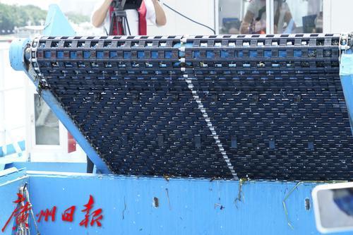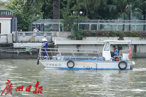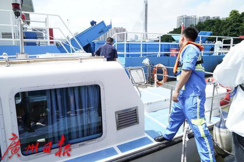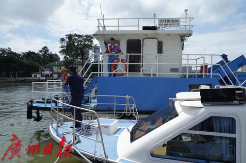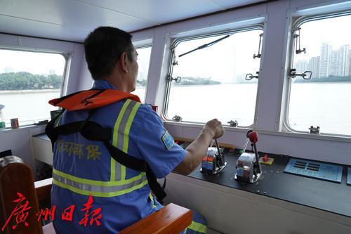 在珠江航道上,一艘23米钢制双体保洁船正在进行环卫保洁工作。船体中央的传输带不断带起水里的垃圾,自动倾倒在船舱里。在靠近岸边处,一艘较小的新式自动保洁船上,一位水上环卫工人不断用网兜捞起水位更浅处的垃圾。10小时巡回保洁,将清捞、收集的水域垃圾运输至市城管部门指定的资源热力电厂焚烧处理,这是广州城管水上工作人员每天的工作。