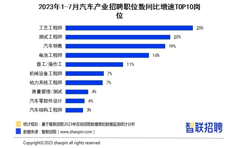 智联招聘最新数据显示,近年随着汽车产业向“新四化”的快速转型,汽车车产业对高技能人才的需求上升明显。今年1-7月,汽车产业招聘职位数增速TOP10中,高技术含量工程师8席。其中,工艺工程师、测试工程师分别以25%和20%的同比增幅排名前两位。此外,汽车销售、普工/操作工岗位的招聘职位数同比增幅分别为19%、11%,充分体现了汽车作为工业产品和消费品双重属性的特殊用人需求。佩信集团行业研究院的研究报告则指出,智能网联和三电的中高端人才需求持续旺盛,每年增速超过 30%。