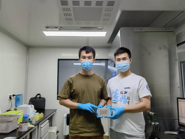论文共同第一作者吴志生(左)和王泽帅(右)完成第1000块孔板的细胞分选之后。(科研团队供图)