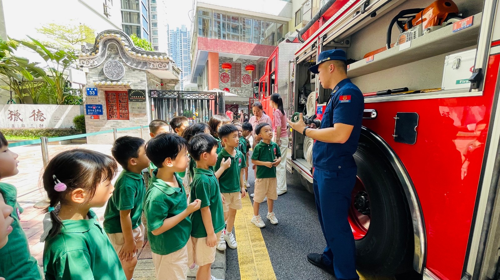 消防车前,消防员向小朋友介绍消防器材的使用方法,普及消防知识。(来源:广州市天河区珠江新城猎德幼儿园)