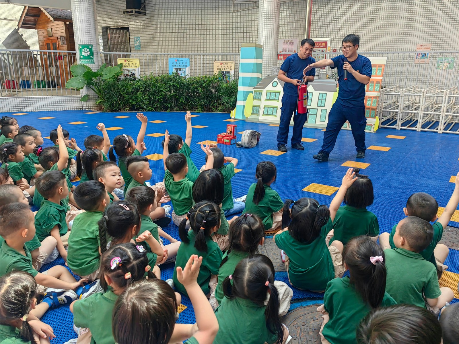 消防员现场为小朋友演示灭火器的使用方法,并以问答的形式帮助小朋友巩固安全知识。(来源:广州市天河区珠江新城猎德幼儿园)