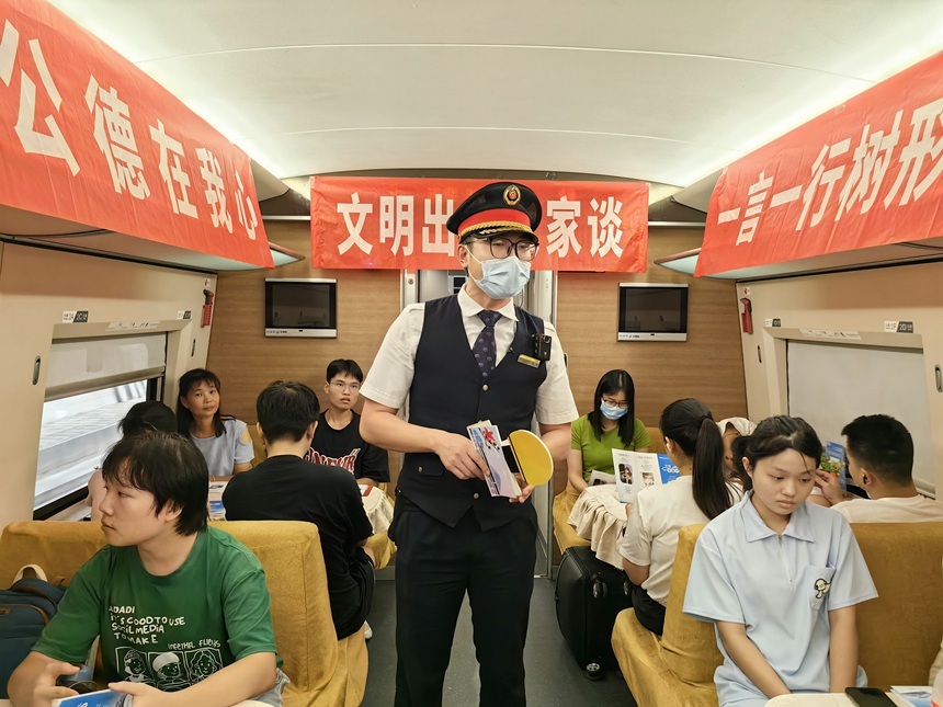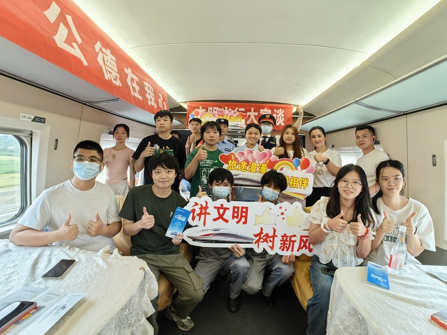 与此同时,京广动三车队所值乘广州南开往武汉的G1110次高铁上,正组织开展“文明出行大家谈”主题宣传活动。