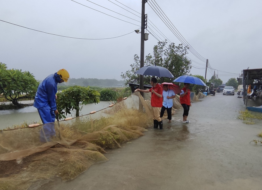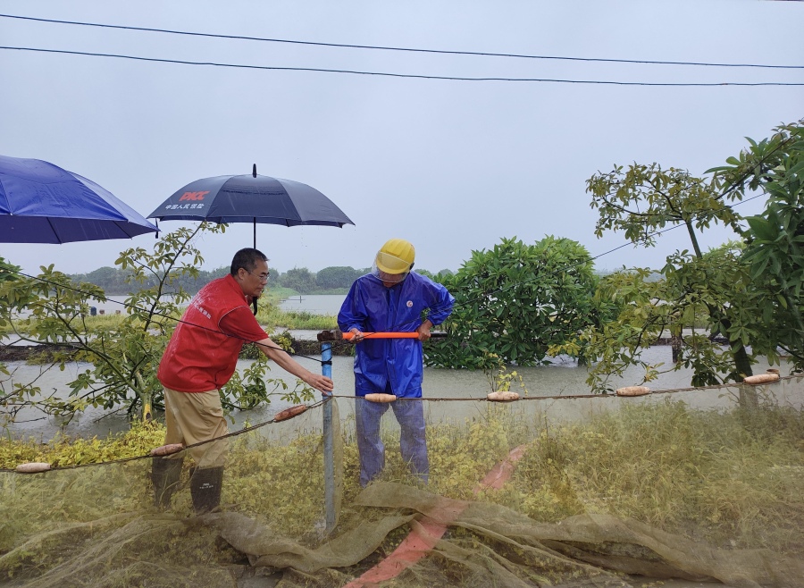 9月8日,理赔人员冒雨在鱼塘边帮助养殖户拉起拦网,减少损失。