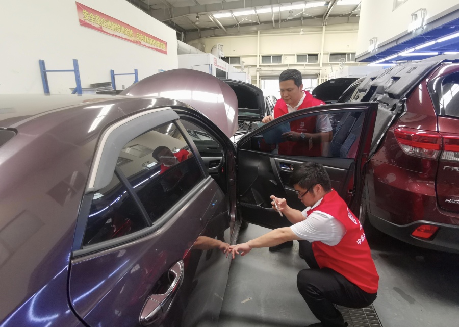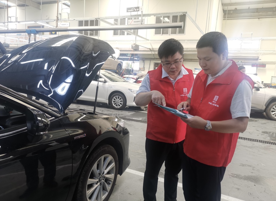 理赔人员在汽车4S店和修理厂内为受浸车辆加紧定损