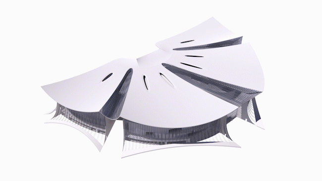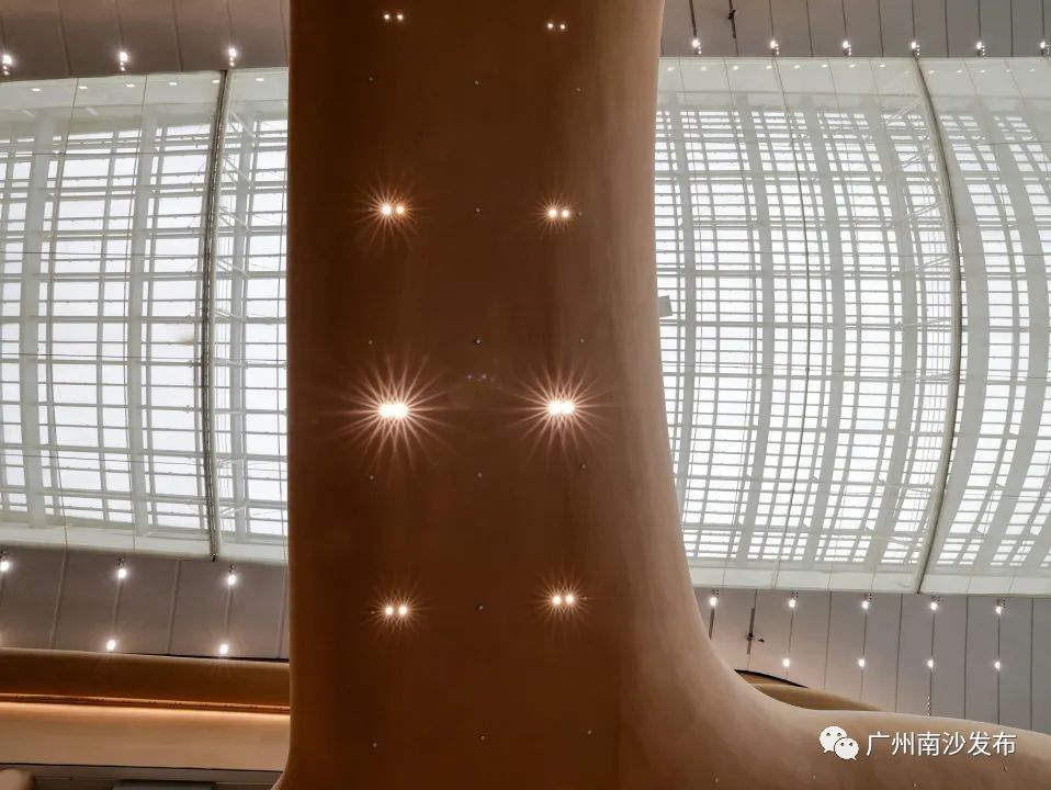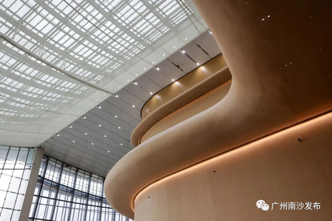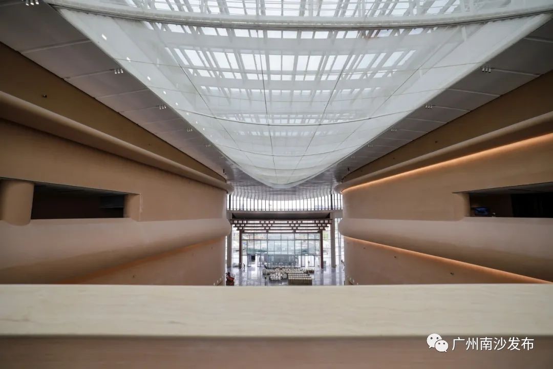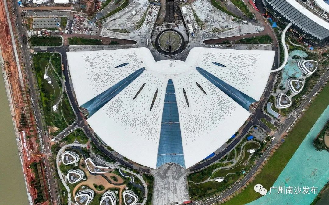 广州南沙明珠湾管理局相关负责人介绍道,IFF永久会址屋面造型由四瓣金属大屋盖穿插三瓣玻璃采光顶,“波折起伏”富有节奏动感,生动捕捉了木棉花开的动态美,更是对中国传统建筑古韵清雅的传承。