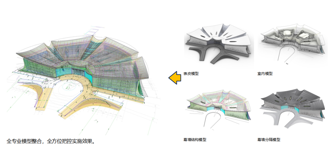 通过建筑结构幕墙一体化数字设计逻辑,实现重要建筑结构的精细化数字控制协同设计;通过建筑设备的精细化建模,实现从室内到管线综合的全过程数字模型精细化设计。