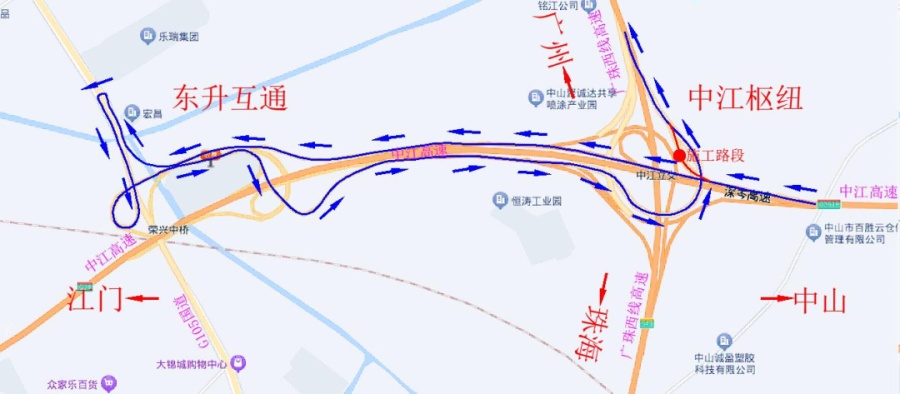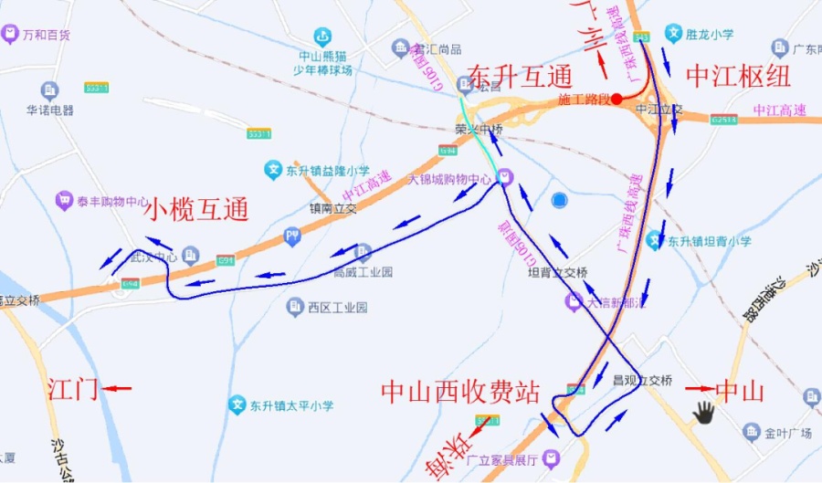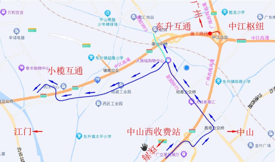 绕行路线:中江高速→中江枢纽→东升收费站→坦背西二马路(调头)→东升收费站→中江高速→中江枢纽→广珠西线高速。